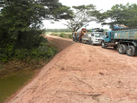 | Do outro lado, a ponte danificada pela onda tóxica recebe reparos. |